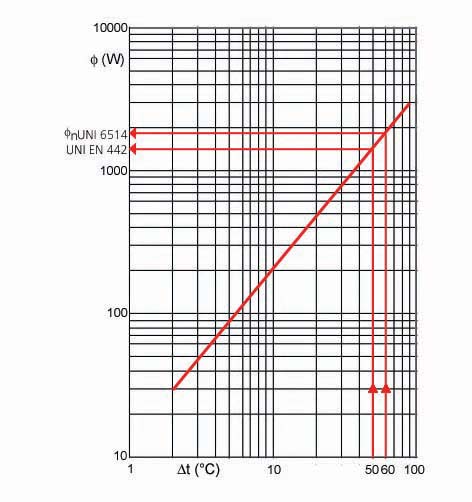 Ove si disponga di un dato di prova certo e certificato UNI EN 442, la norma prescrive il suo utilizzo, previa trasformazione della sua potenza nominale (riferita a Δt = 50 °C) nella potenza termica riferita a Δt = 60 °C: